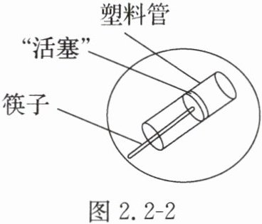 5. 如图2.2 - 2所示,在筷子上捆一些棉花,做一个“活塞”。用水蘸湿棉花后插入两端开口的塑料管中,用嘴吹管的上端,可以发出悦耳的哨音。上下推拉“活塞”,能显著改变声音的(