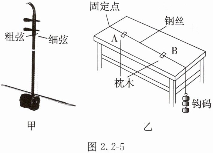 11. 小明在观察如图2.2 - 5甲所示的二胡时猜想:弦发声的音调可能与弦的长度、粗细和松紧程度有关。于是他找来两根粗细不同的钢丝,设计了如图2.2 - 5乙所示的装置,拨动枕木A、B间的钢丝,进行了四次对比探究,四次实验的部分信息如下表所示。