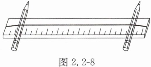 7. 如图2.2-8所示,把橡皮筋绷在直尺上,用两支铅笔将橡皮筋垫起。