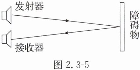 超声波测距原理如图2.3-5所示。发射器向某一方向发射超声波,在发射的同时开始计时,超声波传播时碰到障碍物会被反射,接收器收到反射波就停止计时。根据计时器记录的时间t,仪器自动计算出发射点与障碍物之间的距离。如果障碍物是运动的物体,超声波测量仪还可以测出物体移动的速度。