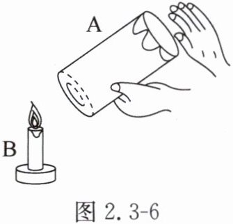8. “声波能否传递能量?”“声波传递的能量与响度是否有关?”小军同学在学习声现象知识时想到了这两个问题,于是在老师帮助下,他设计了实验对这两个问题进行探究。如图2.3-6所示,A为一个圆筒,它的右端用橡皮膜包住并绷紧扎牢,左端蒙上纸(纸的中间剪一圆孔)并粘牢,小孔对准点燃的蜡烛B的烛焰,拍打右端的橡皮膜。观察烛焰。