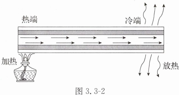 3. 热管原理示意图如图3.3-2所示,管内衬有一层叫吸液芯的多孔材料,里面装有酒精或其他液体,热管可以把高温部分的热量迅速传递到低温部分,其主要是利用了内装物质在高温部分