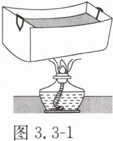 1. 小明在家取一张光滑的厚纸做了一个小纸锅,如图3.3-1所示。纸锅里装些水,放到火上加热(注意不要让火苗烧到水面以上的纸)。过一会儿水就会沸腾,而纸锅并没有燃烧。水的沸腾是剧烈的