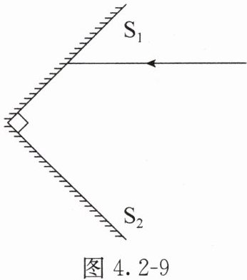 13. 自行车尾灯可有效避免夜间交通事故的发生,它由多组“直角反射器”组成。其中一组“直角反射器”如图4.2-9所示,一束光射向平面镜$S_1,$请在图中画出经过$S_1、$$S_2$两个平面镜反射后的光路图并分析它为什么能减少夜间交通事故。