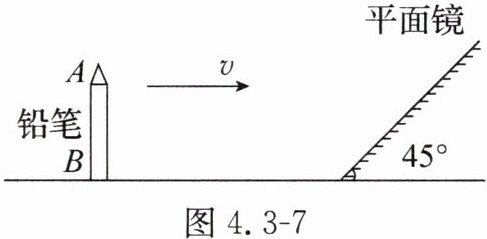 11. 如图 4.3 - 7 所示,平面镜以 $45^{\circ}$ 角倾斜放在水平面上。若一支直立的长 $12\ cm$ 的铅笔 $AB$,以 $5\ cm/s$ 的水平速度向平面镜匀速靠近,则此铅笔的像相对于平面镜的速度为