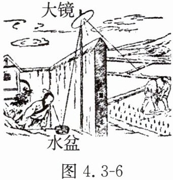 10. 汉代《淮南万毕术》中著有:“取大镜高悬,置水盆于其下,则见四邻矣。”其情境如图 4.3 - 6 所示,该装置是世界上有记载的最早的潜望镜,其中涉及的光学知识分析正确的是(