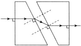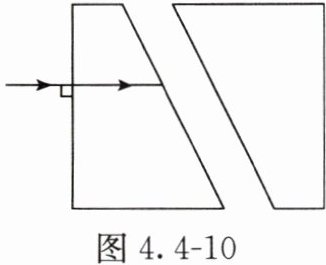 12. 将一矩形玻璃砖从中间斜切后,向左右沿水平直线拉开一小段距离,如图4.4 - 10所示。一束光从左侧面垂直射入,画出这束光从右侧玻璃砖射出的折射光路图,保留作图痕迹。