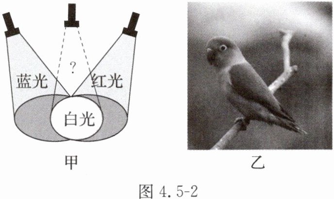 、蓝三种色光照到白纸上(如图4.5-2甲所示),中间相互重叠区域会出现白色。当白光照到鹦鹉图片上时(如图4.5-2乙所示),鹦鹉的嘴呈红色,翅膀呈绿色;当用红光照射时,嘴呈红色,翅膀呈黑