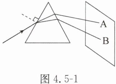 1. 如图4.5-1所示,让一束太阳光照射三棱镜,射出的光射到竖直放置的白屏上,在白屏上形成一条彩色光带,若白屏上A、B是光带边缘的色光,则A为
