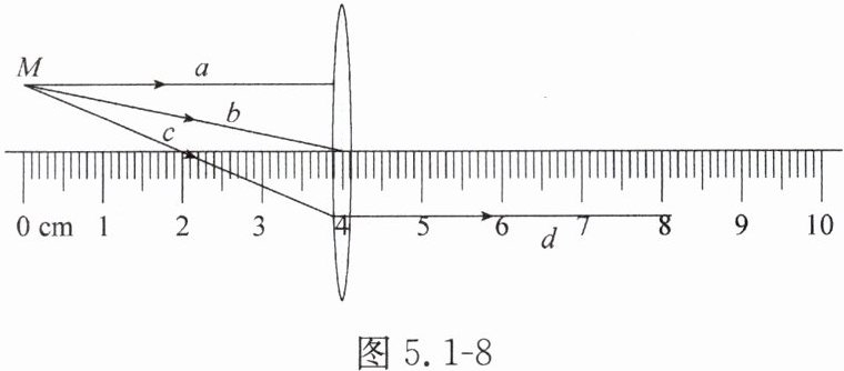 14. 如图5.1-8所示,a、b、c是光源M发出的三束光,已知光线c经过凸透镜后的折射光线为d,其中a、d均平行于主光轴。由图可知,该凸透镜的焦距为____cm。请在图中画出光线a、b经过凸透镜之后的折射光线。
