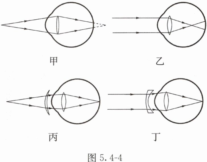 4. 现代生活中智能手机给人们带来了许多便利,但长时间盯着手机屏幕,容易导致视力下降。如图5.4-4所示,下列关于近视眼及其矫正的原理图正确的是(