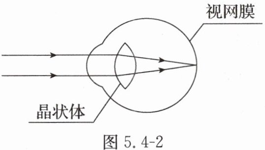 2. 人眼球的成像原理图如图5.4-2所示。当物体在很远的地方时,物体成像在视网膜上。当物体靠近人眼时,若晶状体的焦距不变,则它的像将会落在视网膜