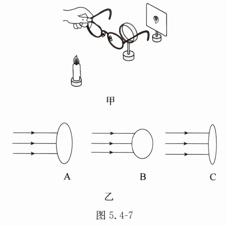7. 某同学进行“视力的矫正”探究活动,他将自己戴的近视眼镜放在蜡烛与凸透镜之间,在光屏上得到了一个缩小、倒立的清晰实像,如图5.4-7甲所示。拿开眼镜后,光屏上的像变得模糊了。