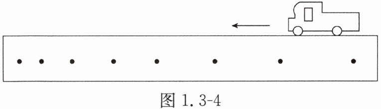 12. 把带有墨水装置的小车放在水平桌面上的纸带上,小车每隔相等的时间滴一滴墨水。当小车向左做直线运动时,在纸带上留下了一系列墨滴,其分布情况如图1.3 - 4所示。设小车滴墨水的时间间隔为 $ t $,在小车从图中第一滴墨水的位置至最后一滴墨水的位置的运动过程中,下列说法正确的是(