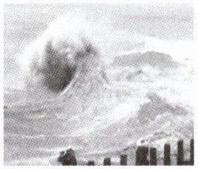 江面上的白线迅速扩展,最终化为高高的水墙,犹如千军万马奔腾而来。声音震耳欲聋,仿佛大地都在颤抖,场面震撼人心。