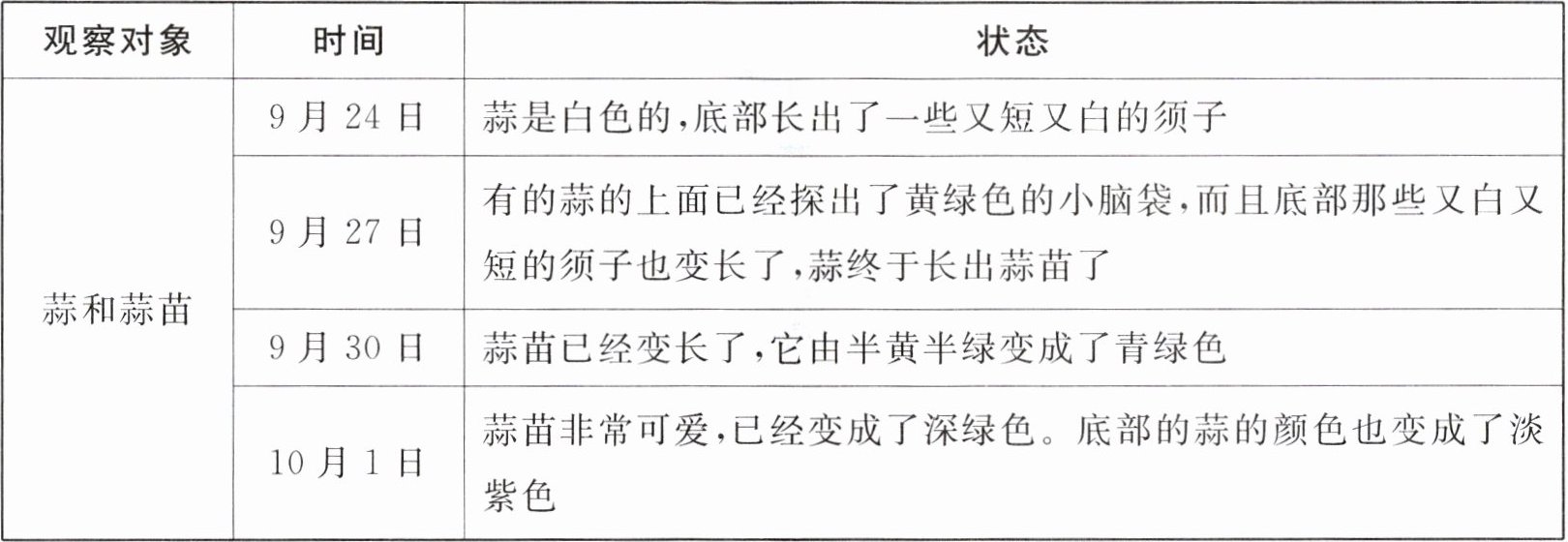 (1)根据观察日记,我们发现东东在观察时特别关注了蒜和蒜苗的颜色变化。
