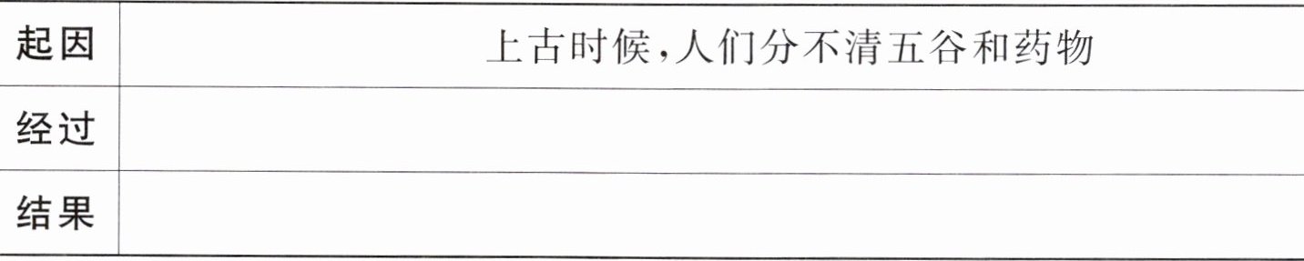 (二)1.神农遍尝百草差点中毒身亡,后来因为有了赭鞭而减少了危险 神农写出了《本草经》,帮助了很多人 2.B 3.示例:赭鞭非常神奇,神农到山上采集草药,会用赭鞭抽打各种植物,如果鞭子变黑,说明此草有剧毒;如果鞭子变红,说明此草性热;如果鞭子变白,说明此草性凉。4.示例:我认为他是一个关心百姓疾苦、舍己为人、甘于奉献的人。