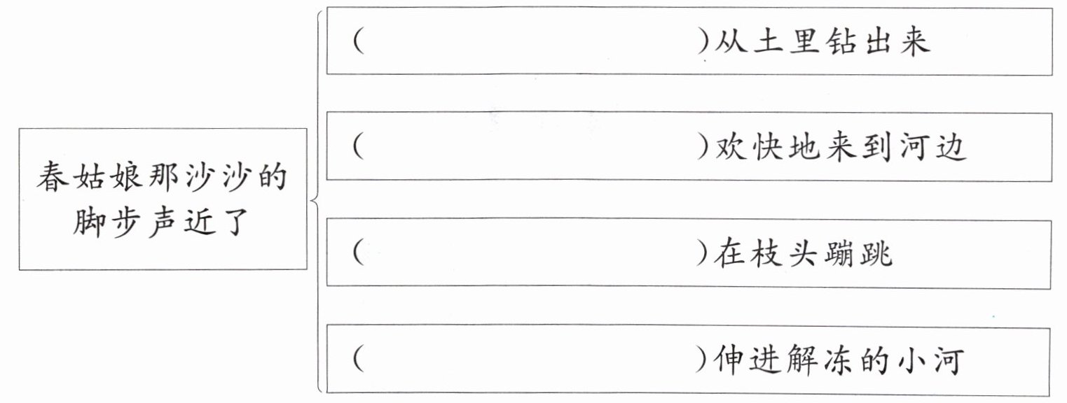 1. ③ ① ② 2. 女 古 纟 文 3. 岸边的小草 成群的牛羊 布谷、喜鹊 垂柳的枝条