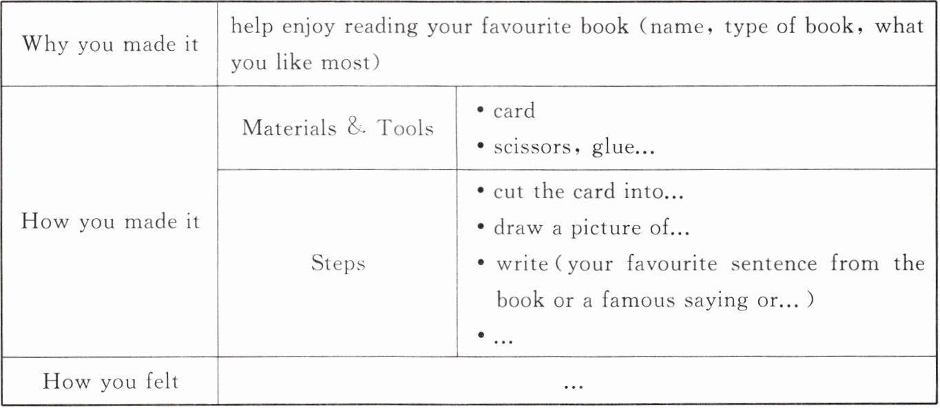 |How you made it|Steps|• cut the card into... • draw a picture of... • write (your favourite sentence from the book or a famous saying or... ) • ...|