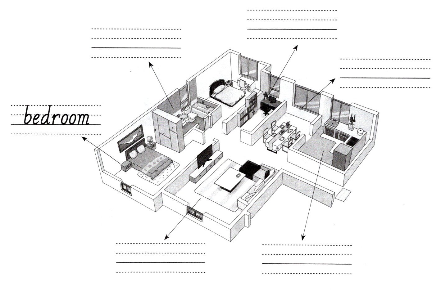( )2. bedroom A. bed B. desk C. living room