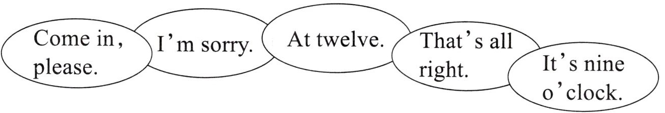1. At twelve. 2. Come in, please. 3. I'm sorry. 4. It's nine o'clock. 5. That's all right.