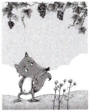 "How nice they are! I want to eat them." The fox jumps and jumps, but the wall is too tall. He can't get the grapes. The fox goes away and says, "I don't like those grapes. They are not good to eat."