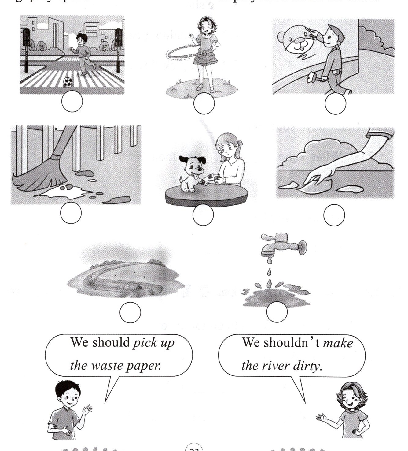 Ⅱ. Choose and talk. 为图片选择相应的短语,并用 We should...或者 We shouldn't...说一说。