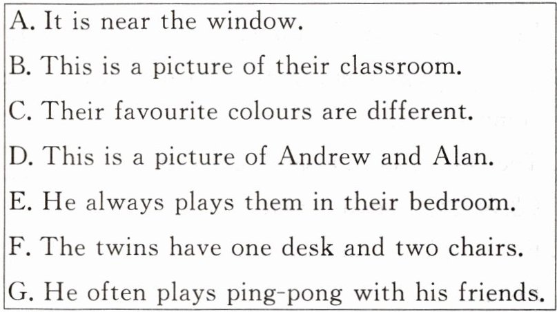 Hi, everyone. Andrew and Alan are my friends. They are twins. ____36____ They look the same, but they are very different. ____37____ Andrew's favourite colour is black, but Alan likes purple best. Look at their bedroom. The two beds look the same. This bed is Andrew's. ____38____ That one is Alan's. It's near the door. Andrew's things are everywhere on the bed, but Alan's bed is very tidy. ____39____ Their clock, books and pencils are on the desk. Their schoolbags are on the chairs. Andrew likes playing computer games. ____40____ For Alan, he likes reading very much, so he always goes to the library.