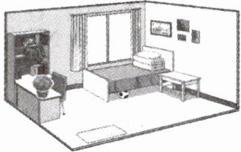 the bed. There is a pot(花盆) on the desk with a plant 16. in