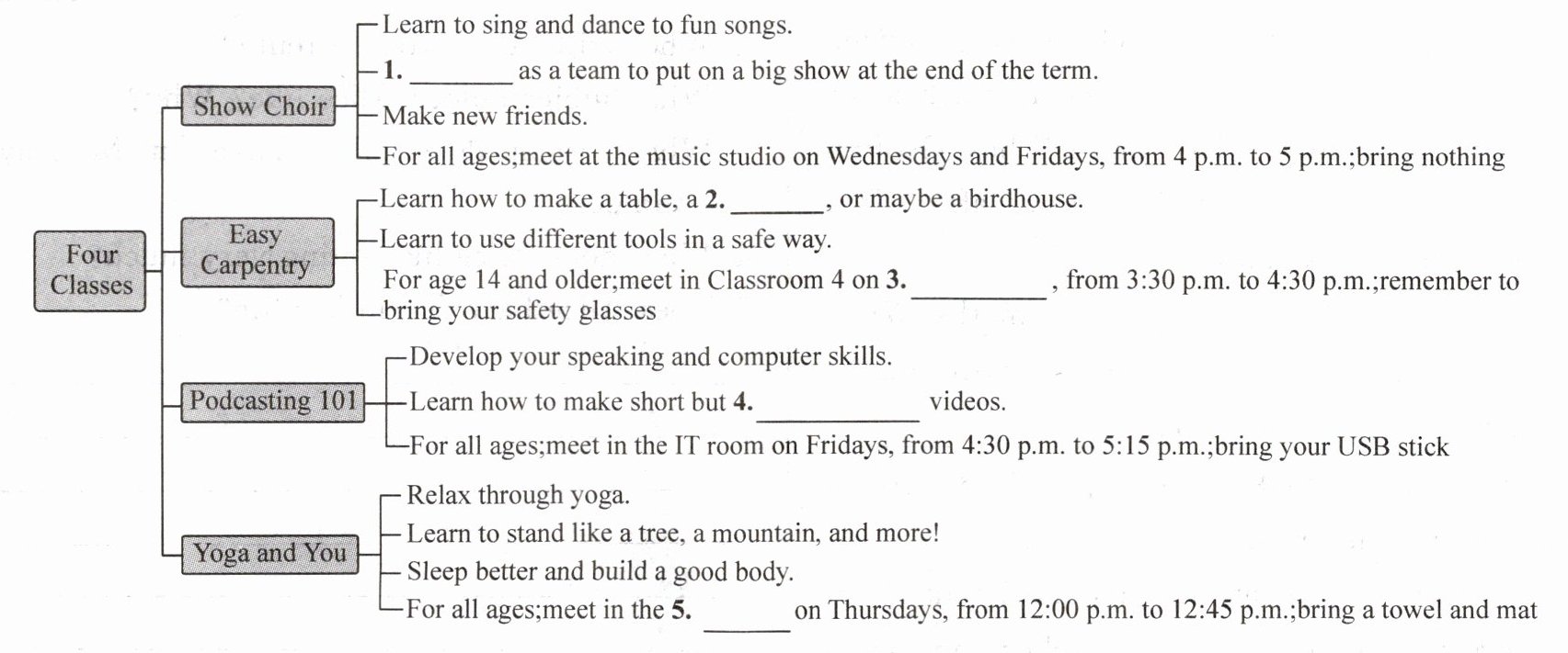 1.Work 2.chair 3.Mondays 4.interesting 5.gym