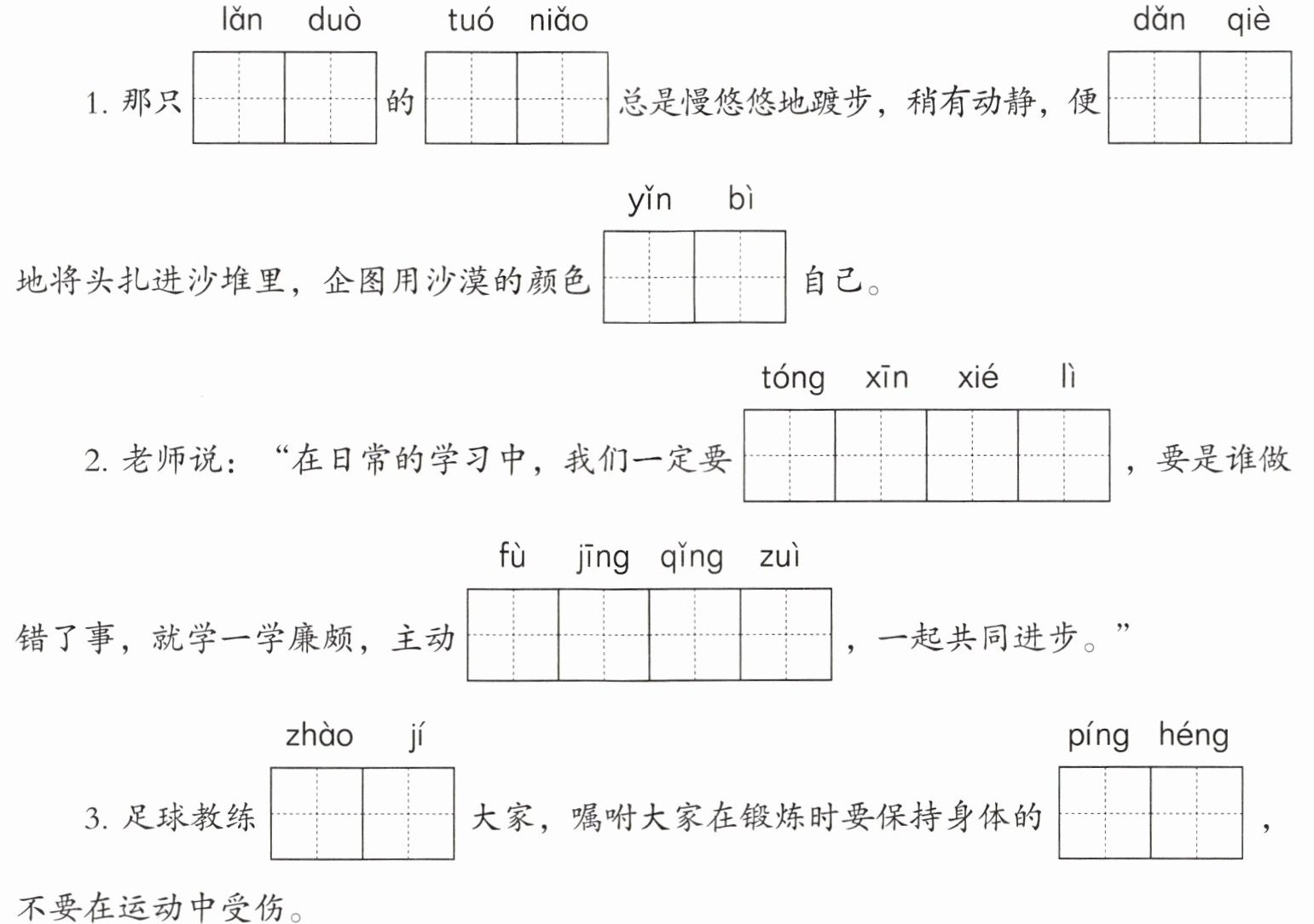 三、将下列词语补充完整,并用画线的词语写一句话。