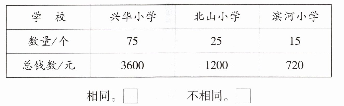 3. 下面是3所小学购买计算器的数量和所付的总钱数。他们购买的计算器的单价相同吗?在正确的答案后打“√”。