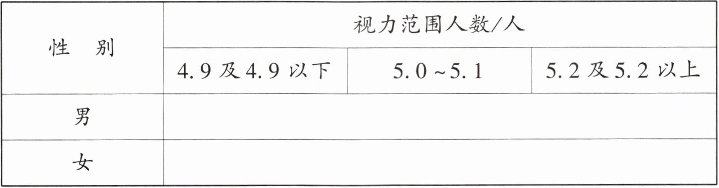 男生$5.0\sim5.1$范围人数是$12$人;女生$4.9$及$4.9$以下范围人数是$11$人,$5.0\sim5.1$范围人数是$10$人。