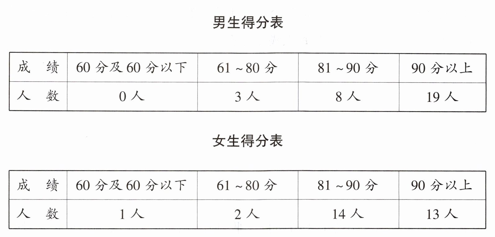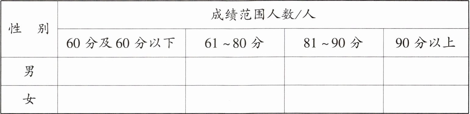 2. 观察统计表,成绩在哪个范围的女生人数比男生多?