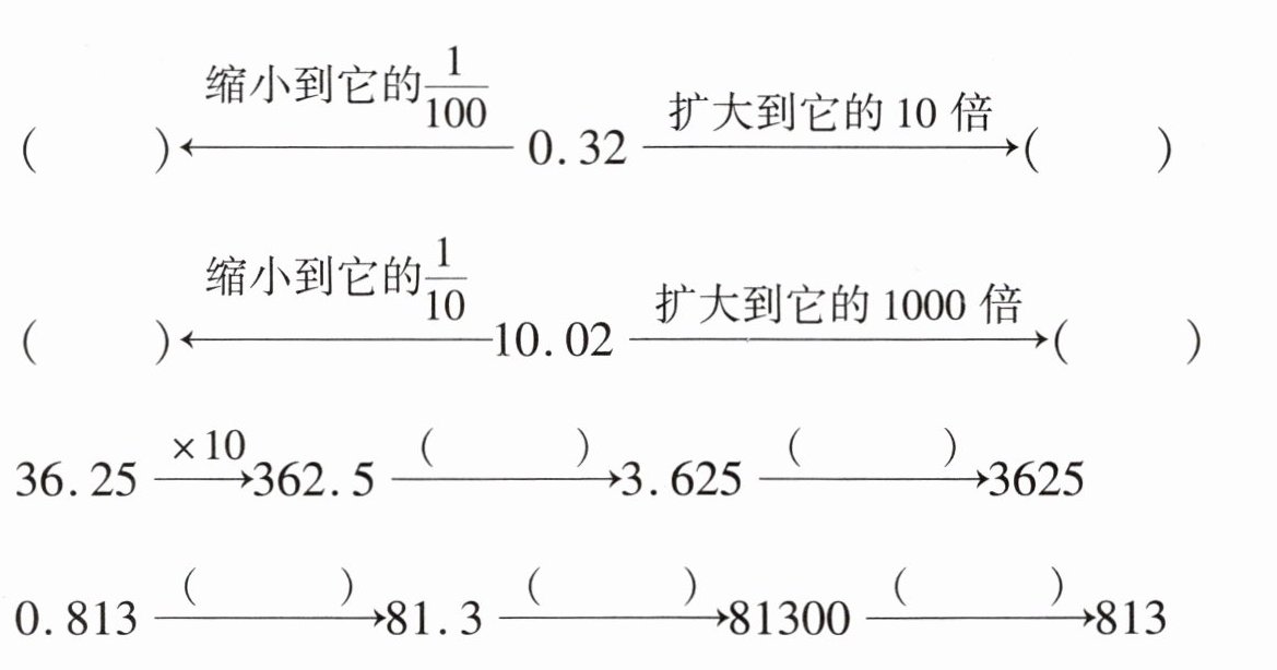 (4) 一个数先扩大到它的100倍,再缩小到它的1/10,只需将小数点向右移动1位。(