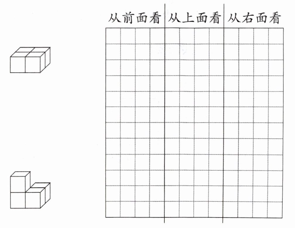五、看一看,想一想,画一画。(下面的物体从前面、上面、右面看到的形状分别是什么?在方格纸上画一画。)