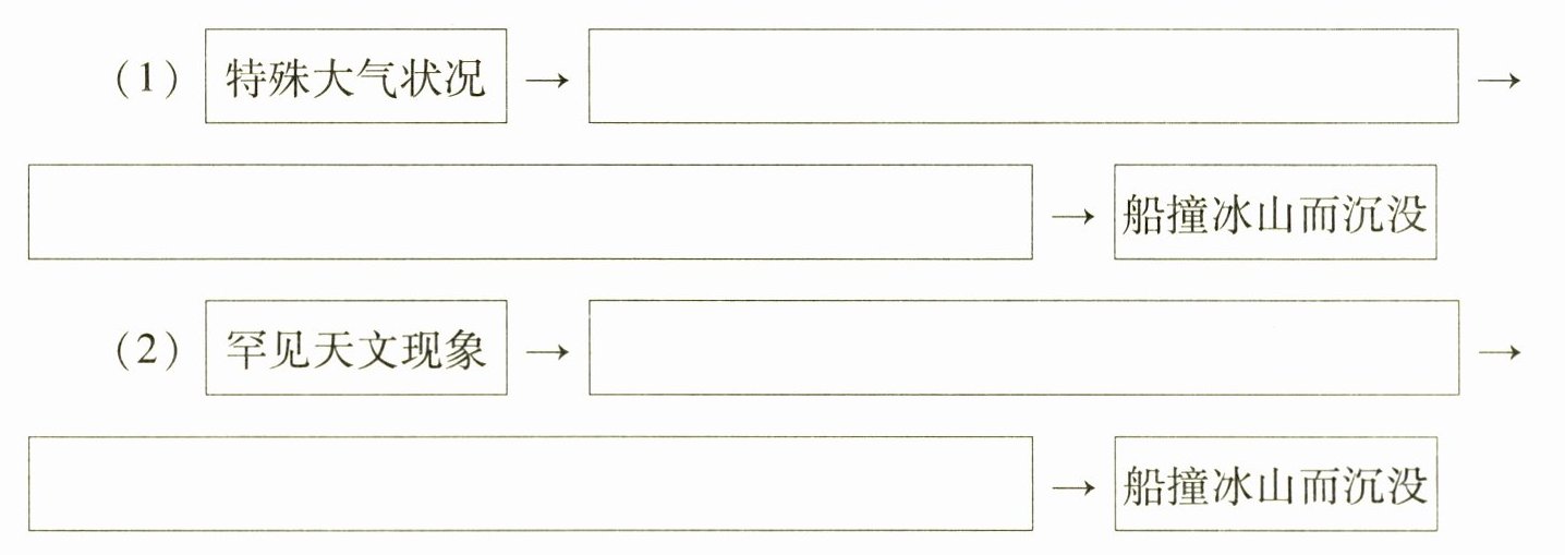 4. (1)形成海市蜃楼 泰坦尼克号没能及时发现冰山 (2)海洋潮汐异常升高 冰山从冰川裂开坠海,漂向北大西洋