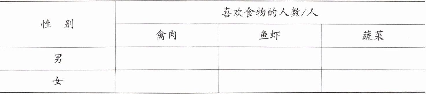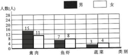 男生、女生喜欢禽肉的人数多,男、女生喜欢蔬菜的人数相同。