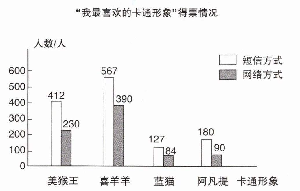 2. 某校在今年6月开展了“我最喜欢的卡通形象”评选活动。下图是前4名卡通形象的得票情况。