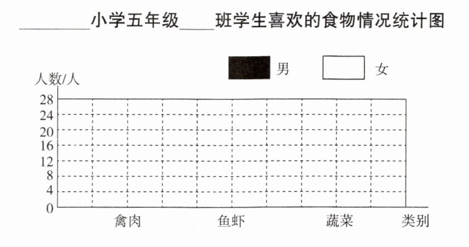 调查本班男生、女生喜欢的食物,完成统计表和统计图,并回答问题。