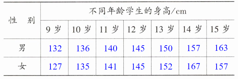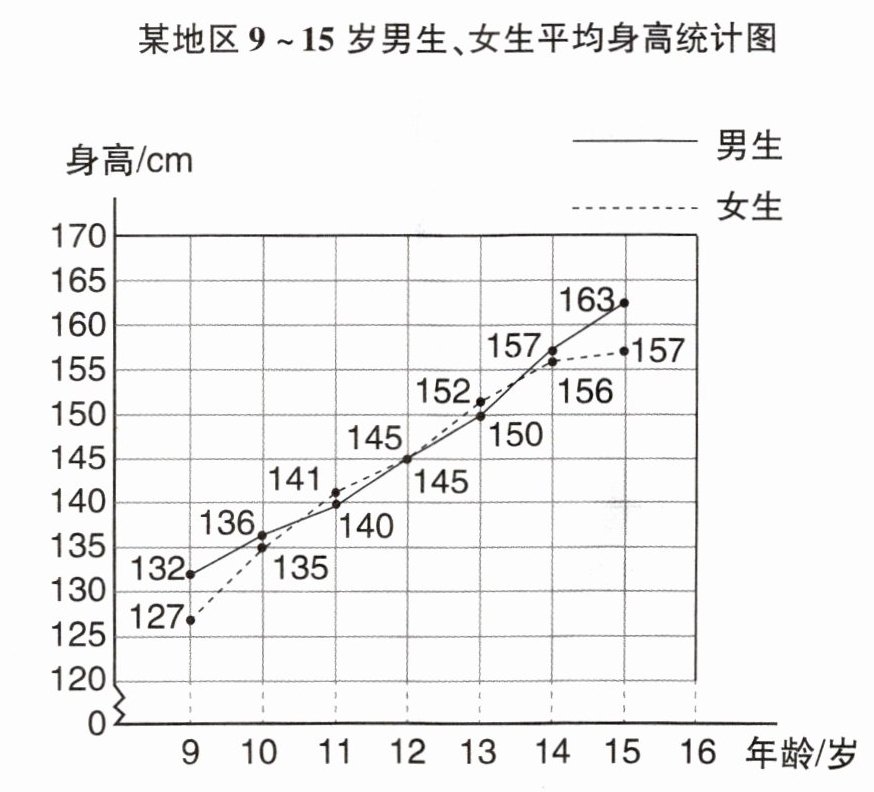 (2)( )岁时,男生和女生的平均身高相差最大。