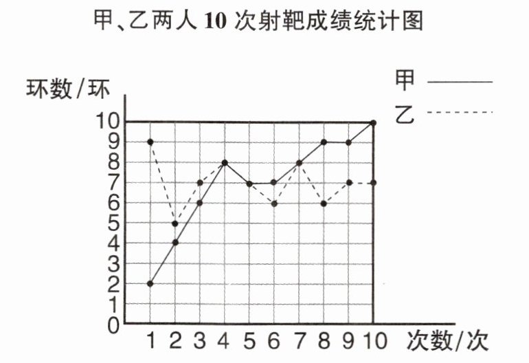 2. 甲、乙两人在相同条件下各射靶10次,每次射靶的成绩情况如下图所示。
