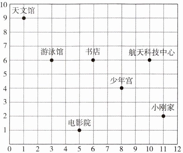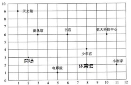 (3)星期天,小刚的活动路线是(11,2)→(10,6)→(6,6)→(1,9)→(3,6)→(5,1)→(8,4)→(11,2)。请按顺序写出他这天去过的地方。