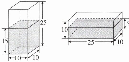 2. 有一个封闭的长方体容器,容器内装着水。如果把该容器长、宽都是10厘米的面作底面放在桌面上,那么这时水面的高度是15厘米;如果把该容器长25厘米、宽10厘米的面作底面放在桌面上,那么这时水面的高度是多少?(单位:厘米。)