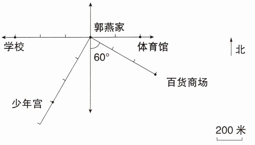 (2) 百货商场在郭燕家( )偏( )( )°方向( )米处。