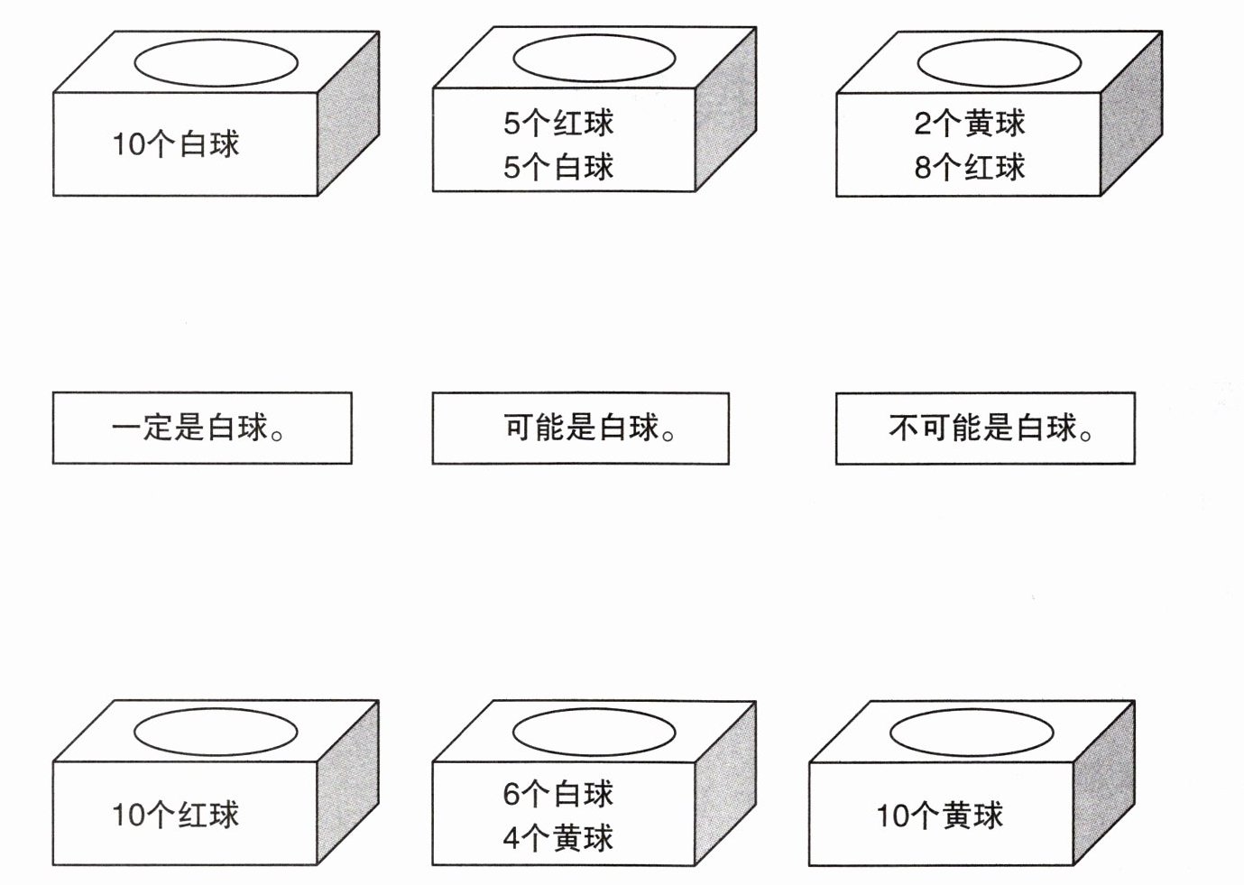 3. 从下列6个盒子中分别摸出1个球,会有怎样的结果?连一连。