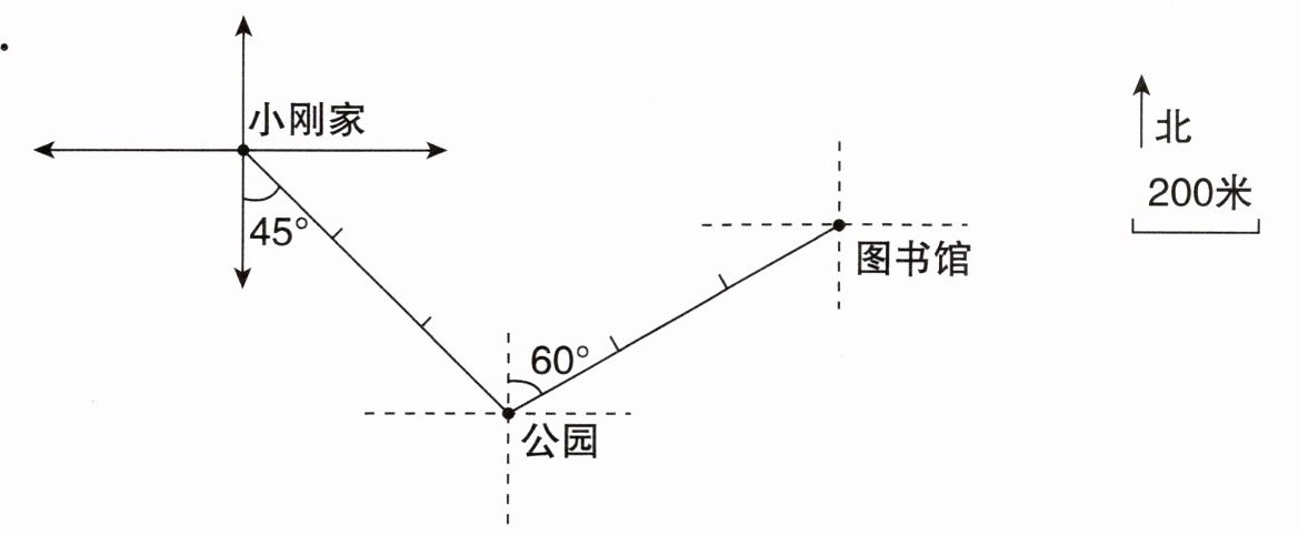 小刚先从南偏西60°方向上走600米到公园,最后向北偏东45°方向走600米到图书馆。