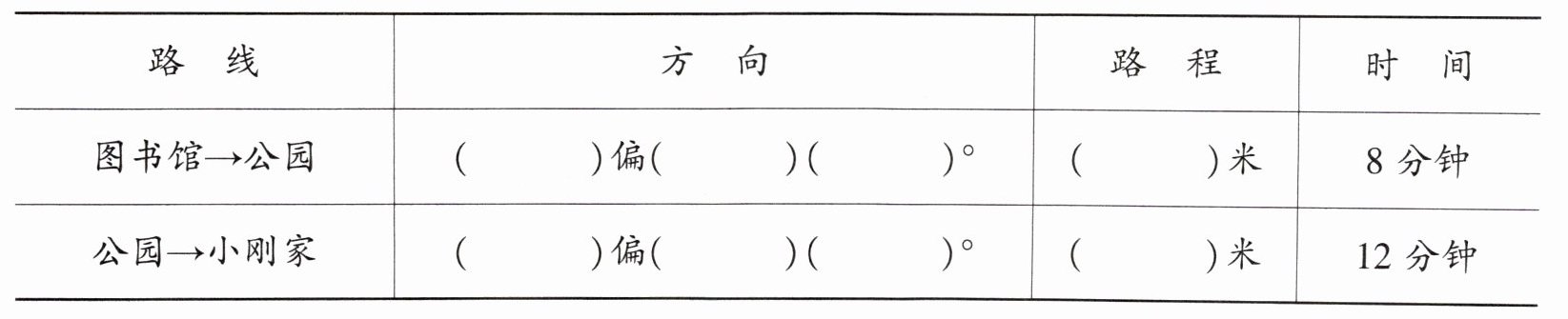 (1)请根据上面的路线图,在下表填出小刚所走的方向和路程。