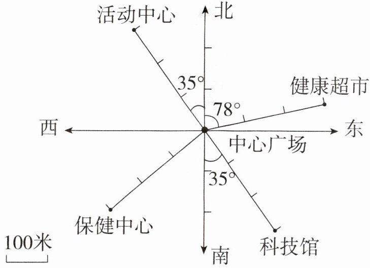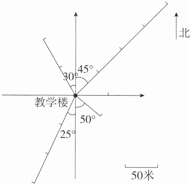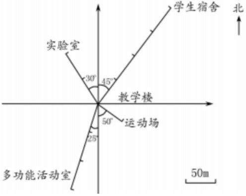 2. 运动场馆在教学楼南偏东50°方向50米处。