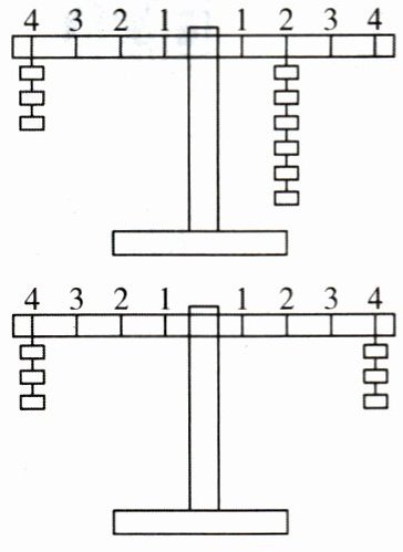 11. (10分)同学们在探究“杠杆原理”时,通过实验发现:当左边刻度$4上放3$个砝码,右边刻度及放砝码数如图所示时,两边平衡.想一想:在右边其余刻度上放几个砝码才能保证平衡?